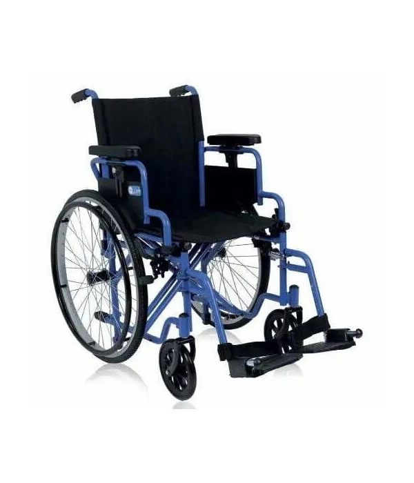 Fotoliu rulant pliabil, conceput pentru confort și siguranță, cu cadru stabilizator din oțel vopsit. Șezutul și spătarul sunt realizate din nailon negru, căptușite și lavabile, iar pe spate este prevăzut cu un buzunar practic pentru documente sau obiecte personale.